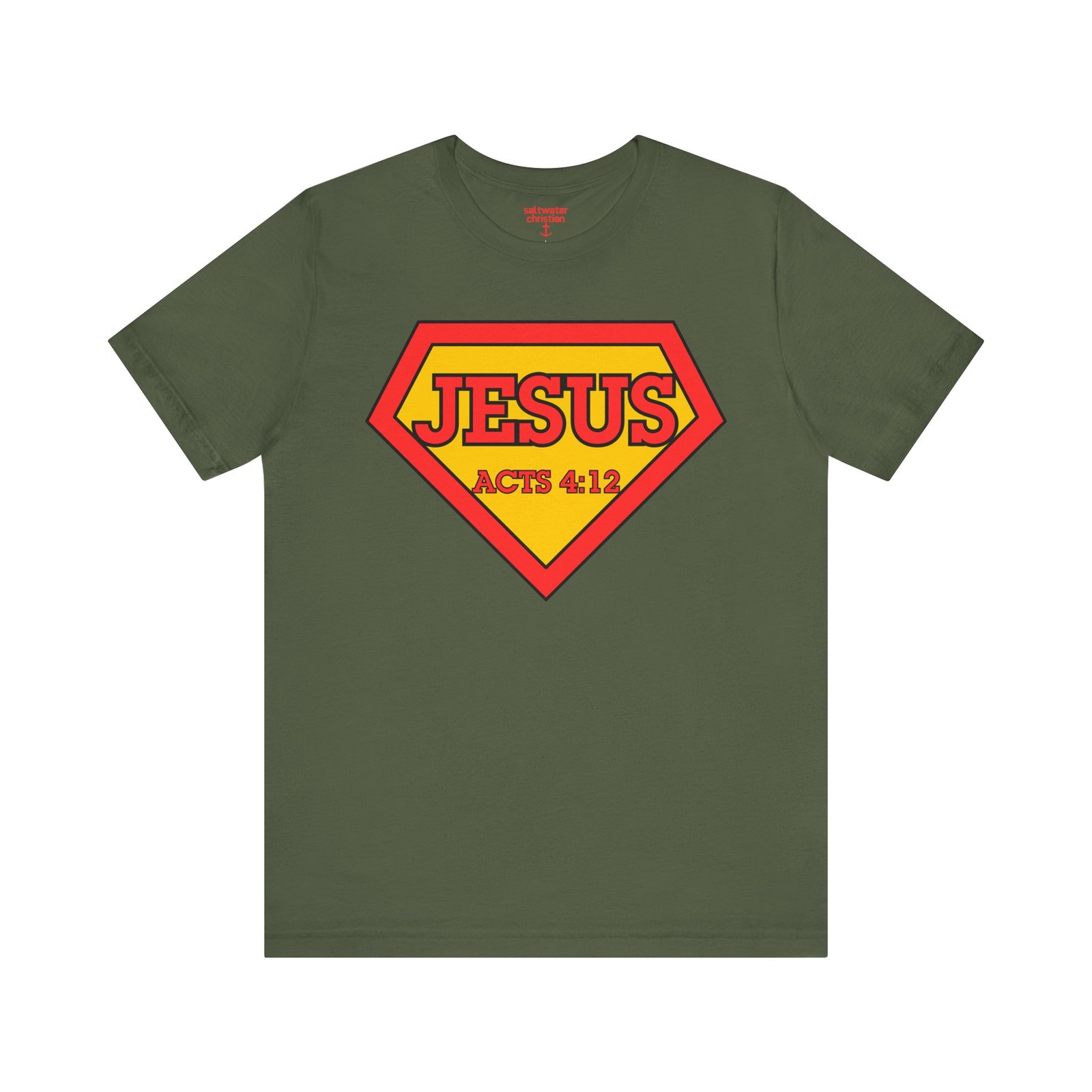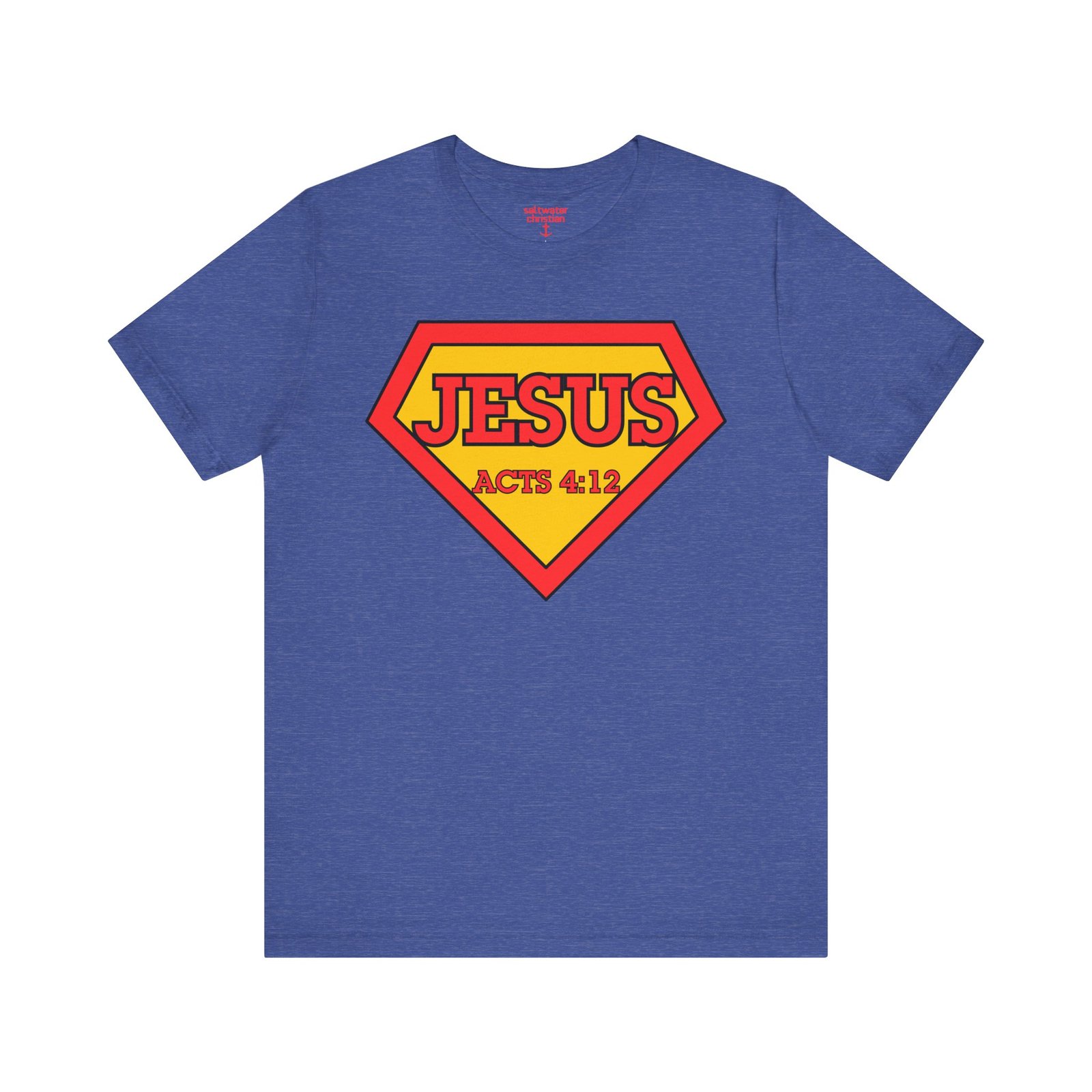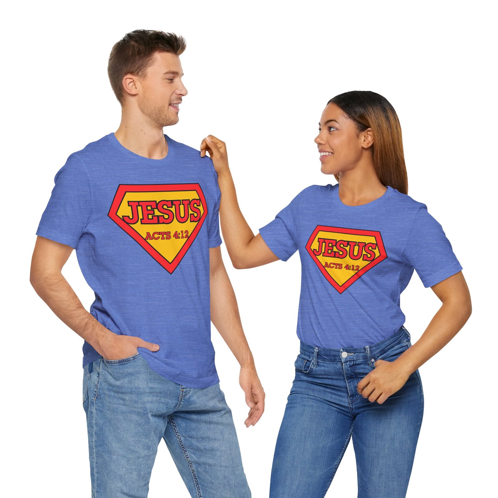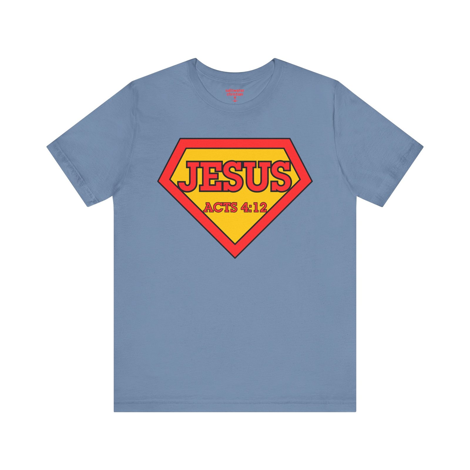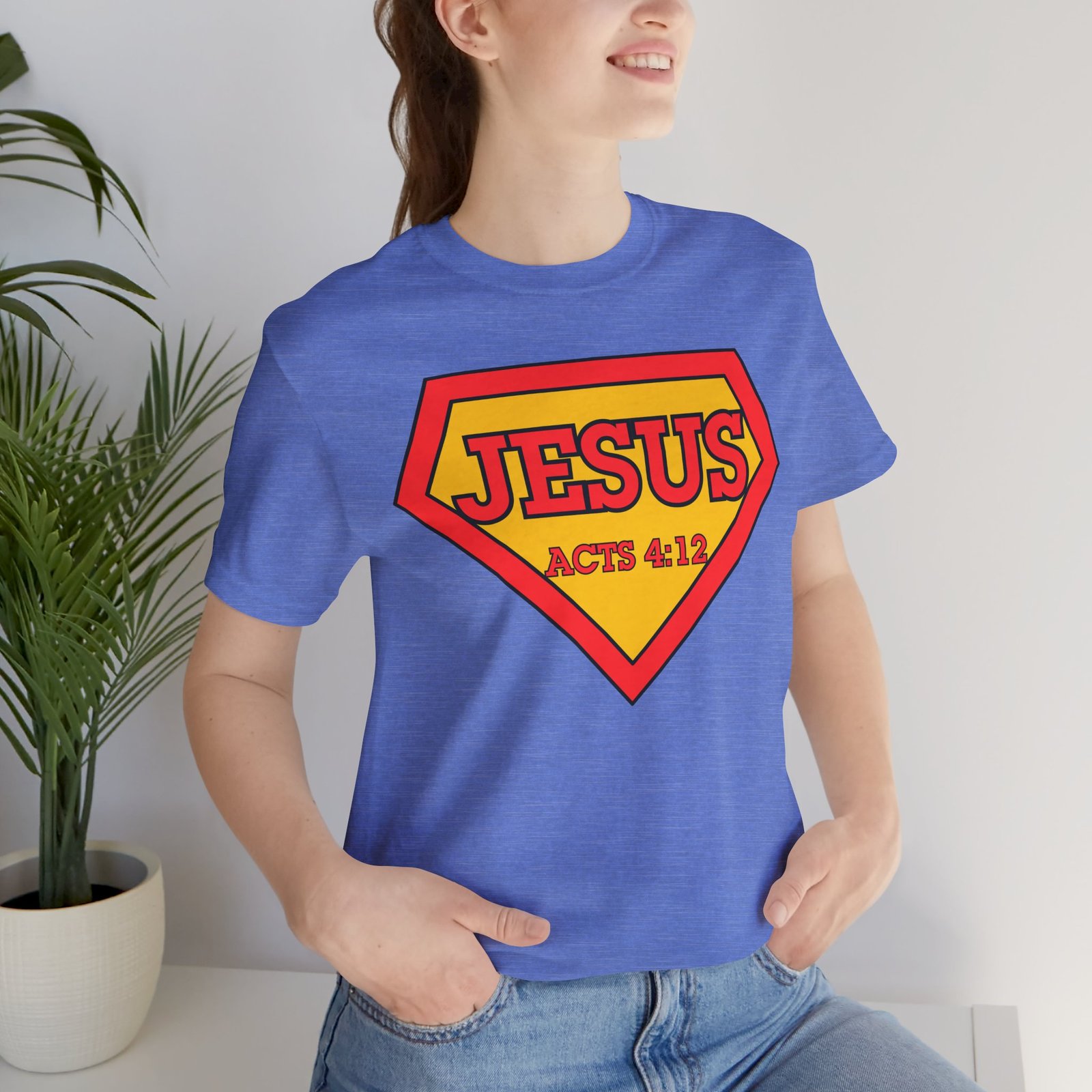 Unleash the ultimate power with this “Jesus” Superman parody shirt. Featuring the iconic Superman logo, but with “Jesus” at the center, this design is a bold statement of the true source of strength and salvation. Inspired by Acts 4:12: “Salvation is found in no one else, for there is no other name under heaven given to mankind by which we must be saved.”