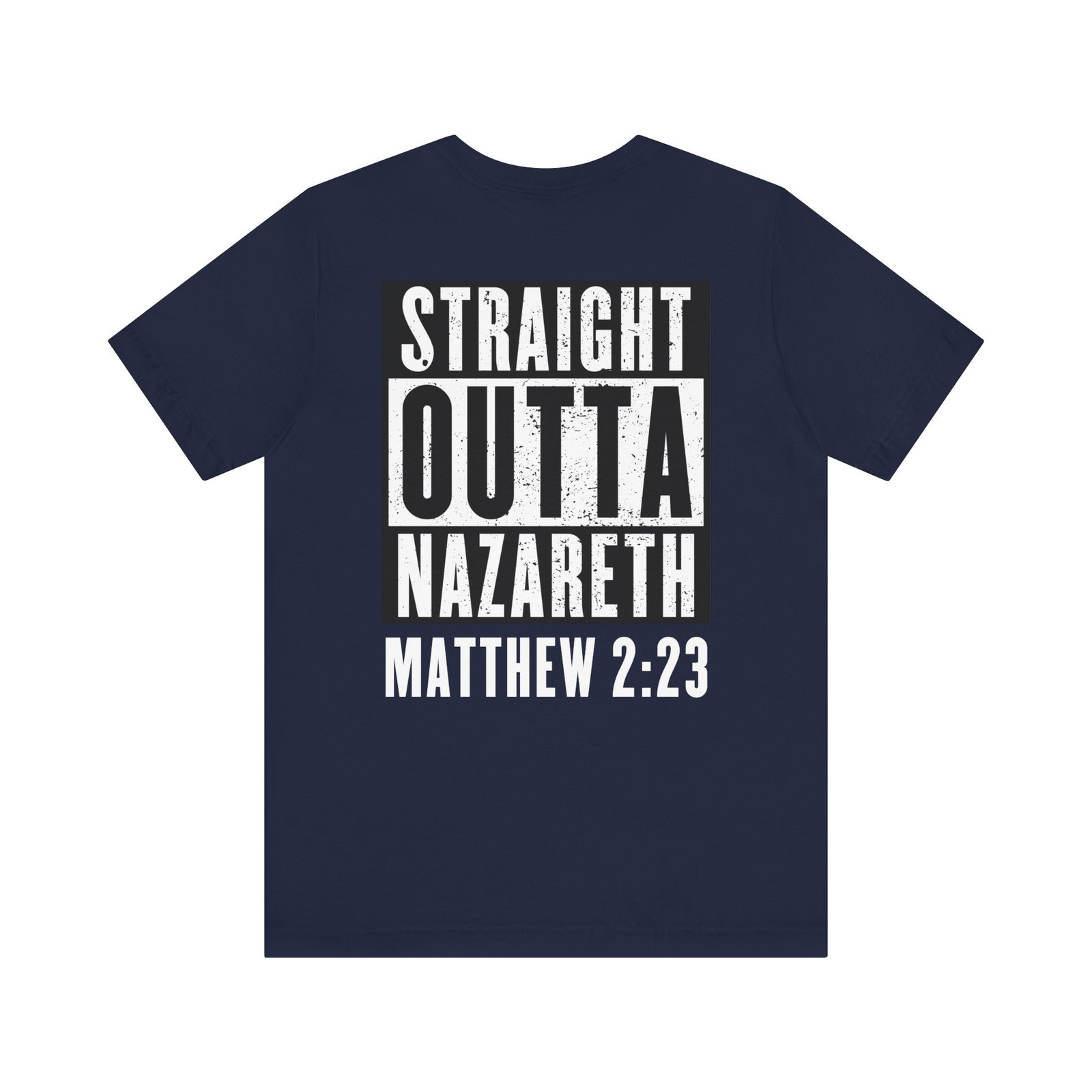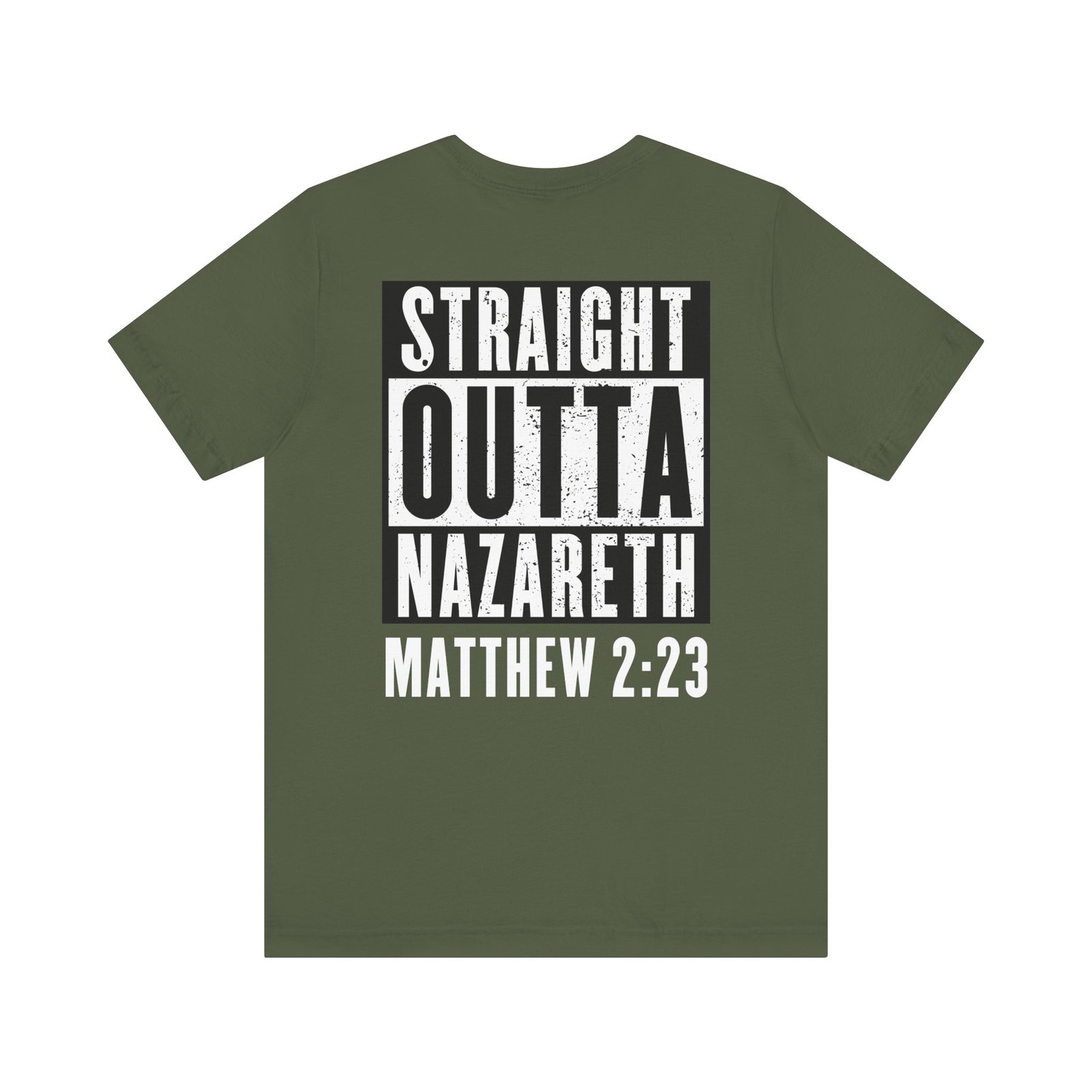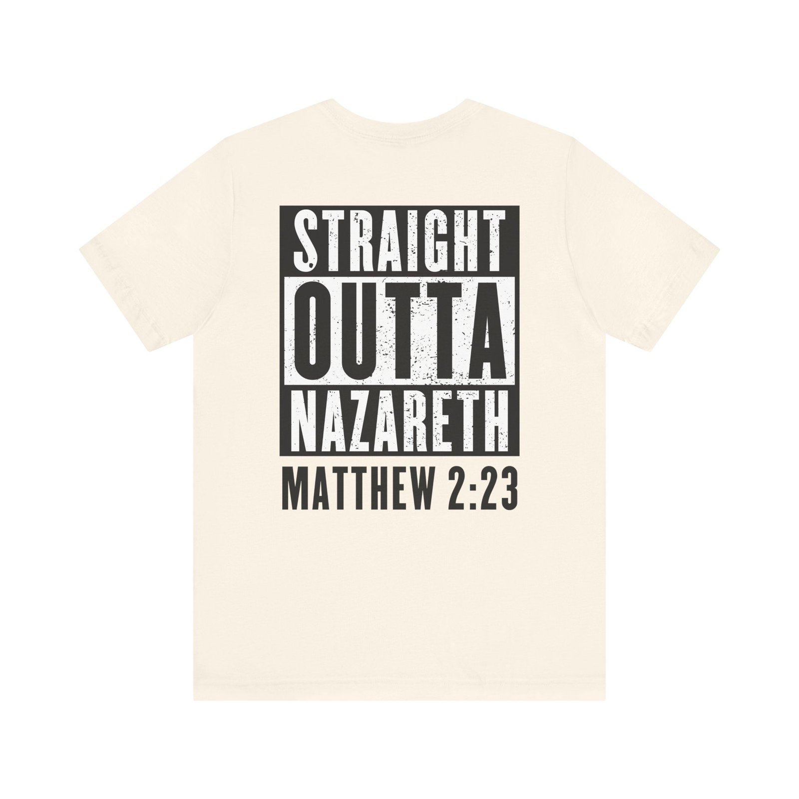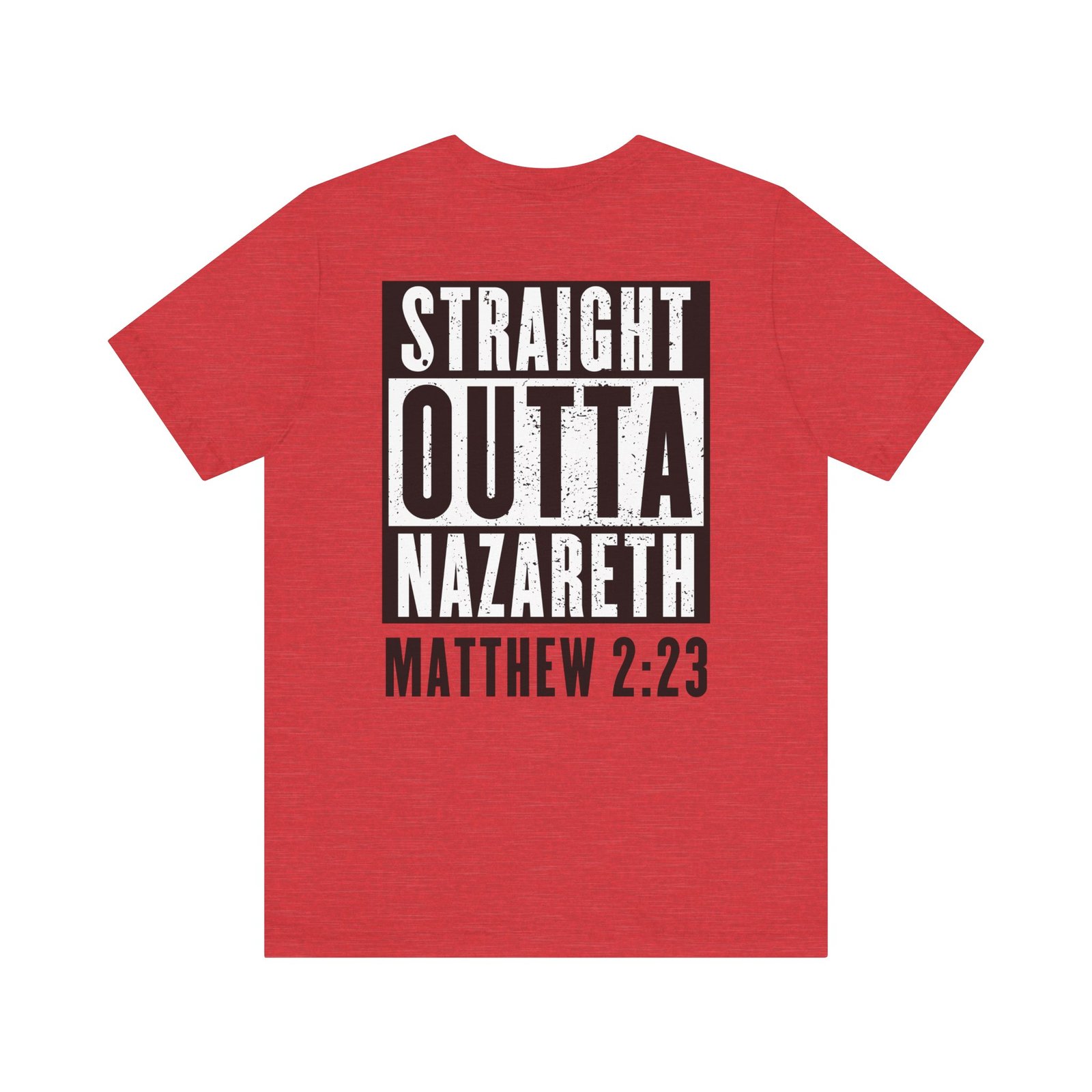 Declare your roots in faith with this bold “Straight Outta Nazareth” design! Inspired by Matthew 2:23: “And he went and lived in a town called Nazareth. So was fulfilled what was said through the prophets, that he would be called a Nazarene,” this shirt honors Jesus’ humble beginnings and His incredible impact on the world.