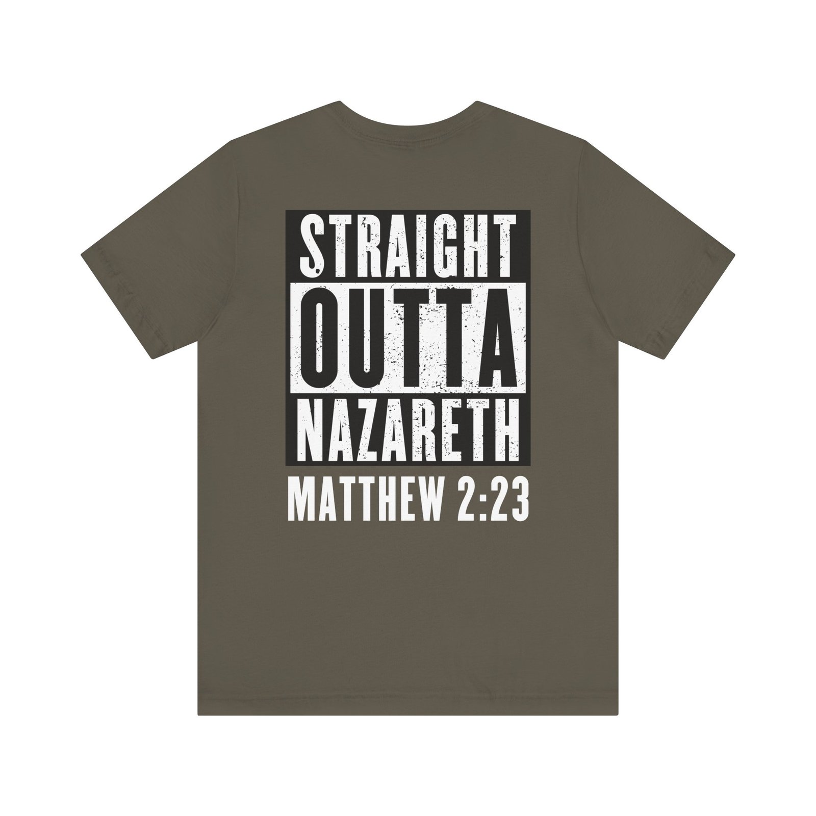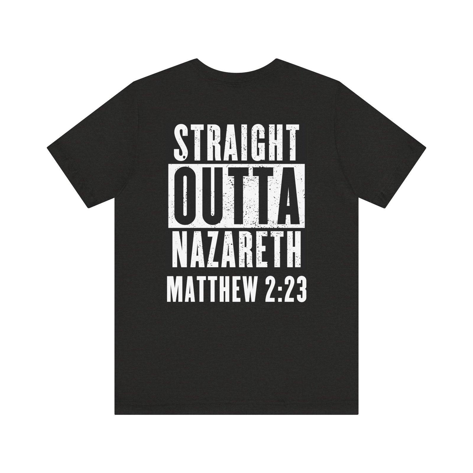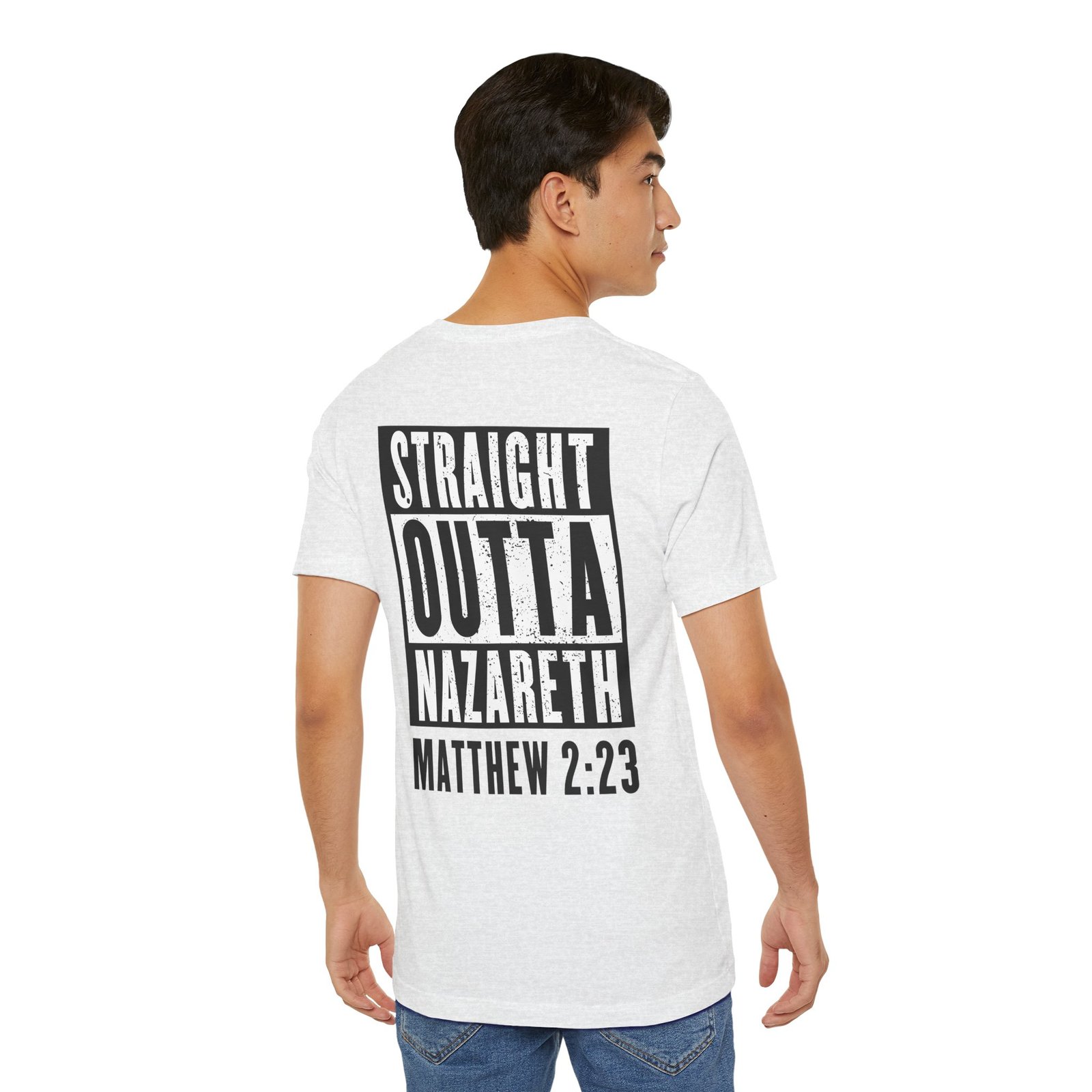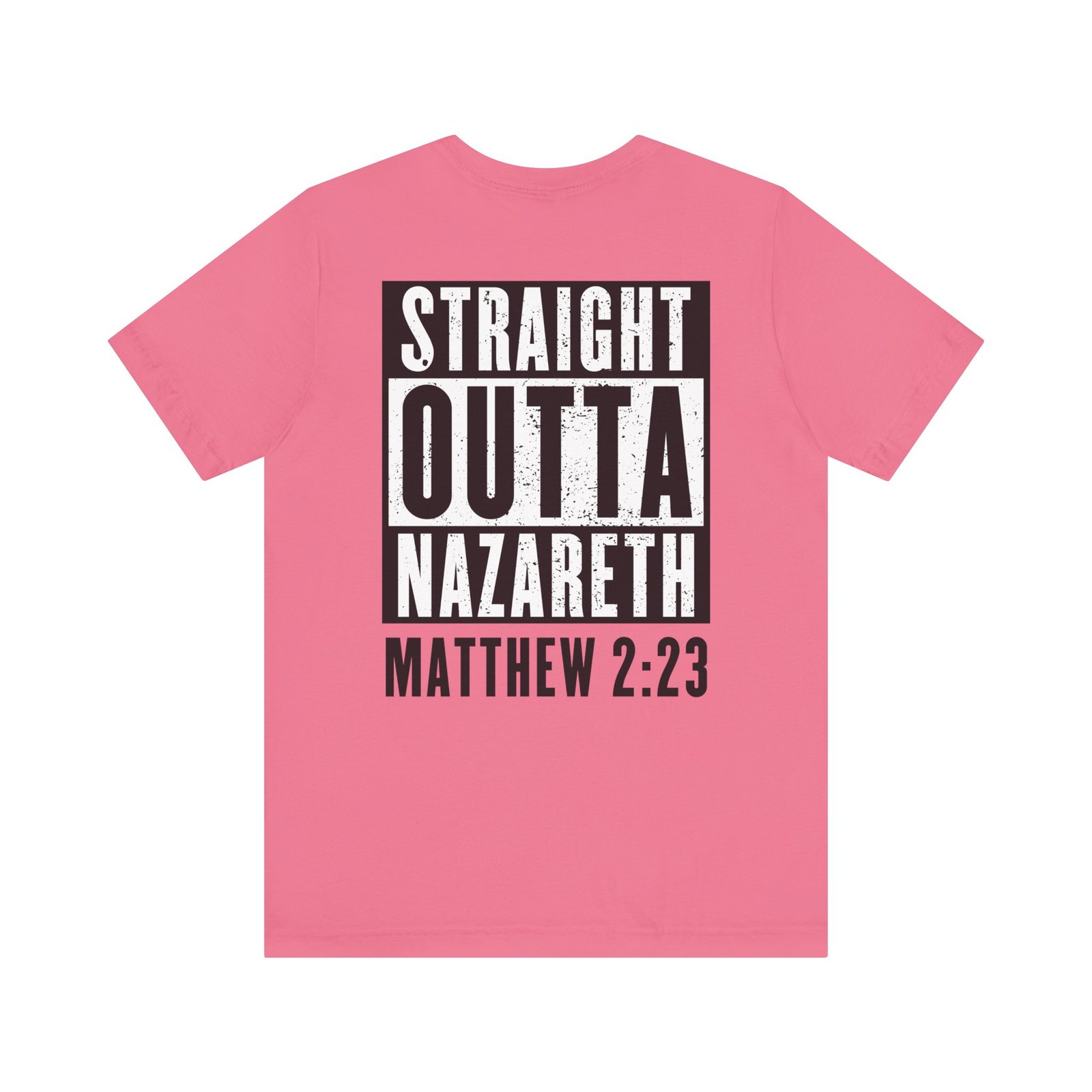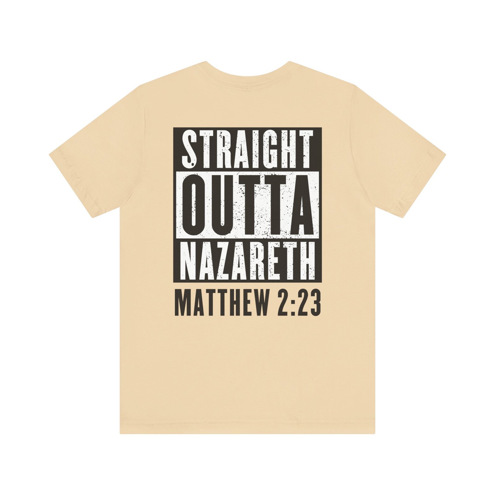Declare your roots in faith with this bold “Straight Outta Nazareth” design! Inspired by Matthew 2:23: “And he went and lived in a town called Nazareth. So was fulfilled what was said through the prophets, that he would be called a Nazarene,” this shirt honors Jesus’ humble beginnings and His incredible impact on the world.